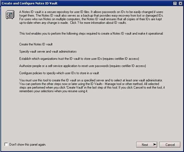 Type password and path of the Vault ID file. As done during Lotus Domino installation for the Certifier, Server and Administrator IDs, copy the Vault ID file and keep it in a safe place to avoid problems if the ID file is deleted from the server. Click Next to continue.