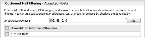 Come Outbound Mail Filtering – Accepted Hosts specificare il dominio o gli indirizzi IP che lo scanner deve accettare per verificare le email in uscita. Aggiungere nel campo IP addresses/domains l’indirizzo IP del mail server aziendale.